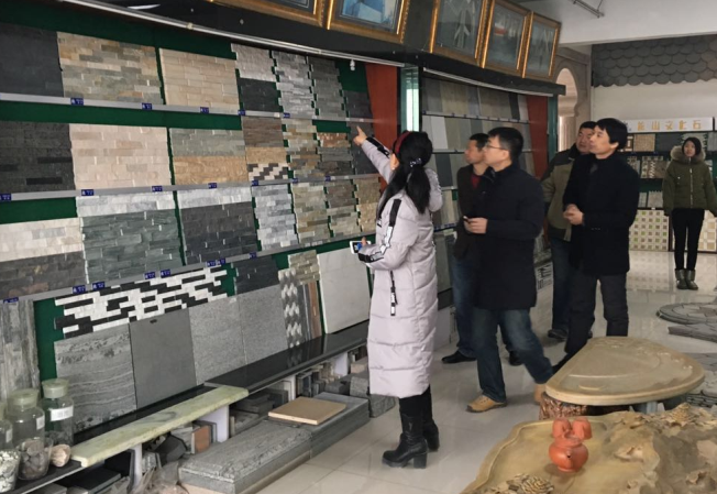 銷售人員為客人講解天然板巖的特性